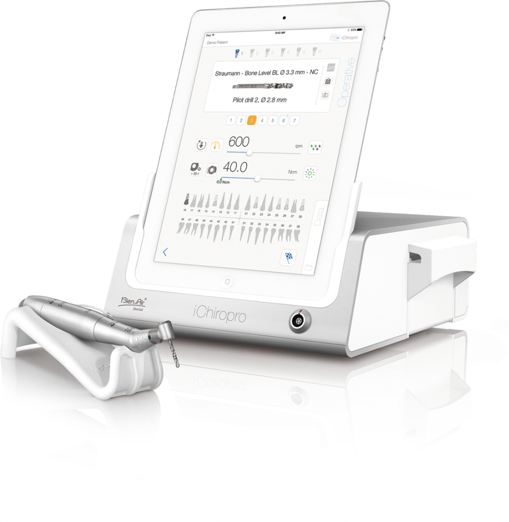 Ci affidiamo inoltre alla tecnologia di iChiropro, il partner perfetto per la nostra tecnica di implantologia. Controllato da un’applicazione iPad, questo sistema ci consente di essere impeccabili in ogni fase delle procedure più sofisticate.